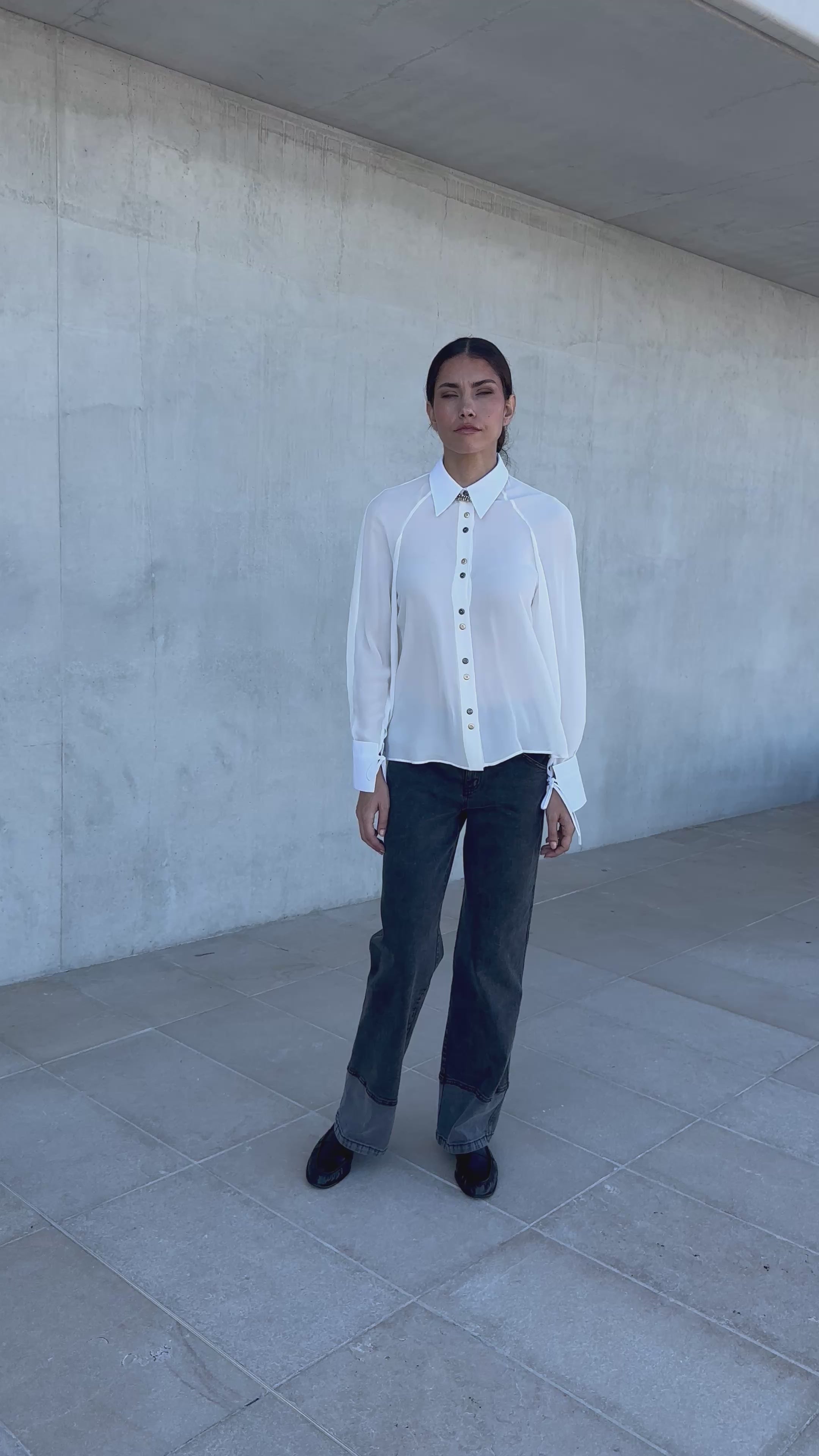 Une chemise lumineuse à l’allure Riviera : du bureau au dîner, elle signe une féminité subtile. Imaginée pour suivre le rythme de la journée, cette chemise joue l’équilibre parfait entre douceur et structure.