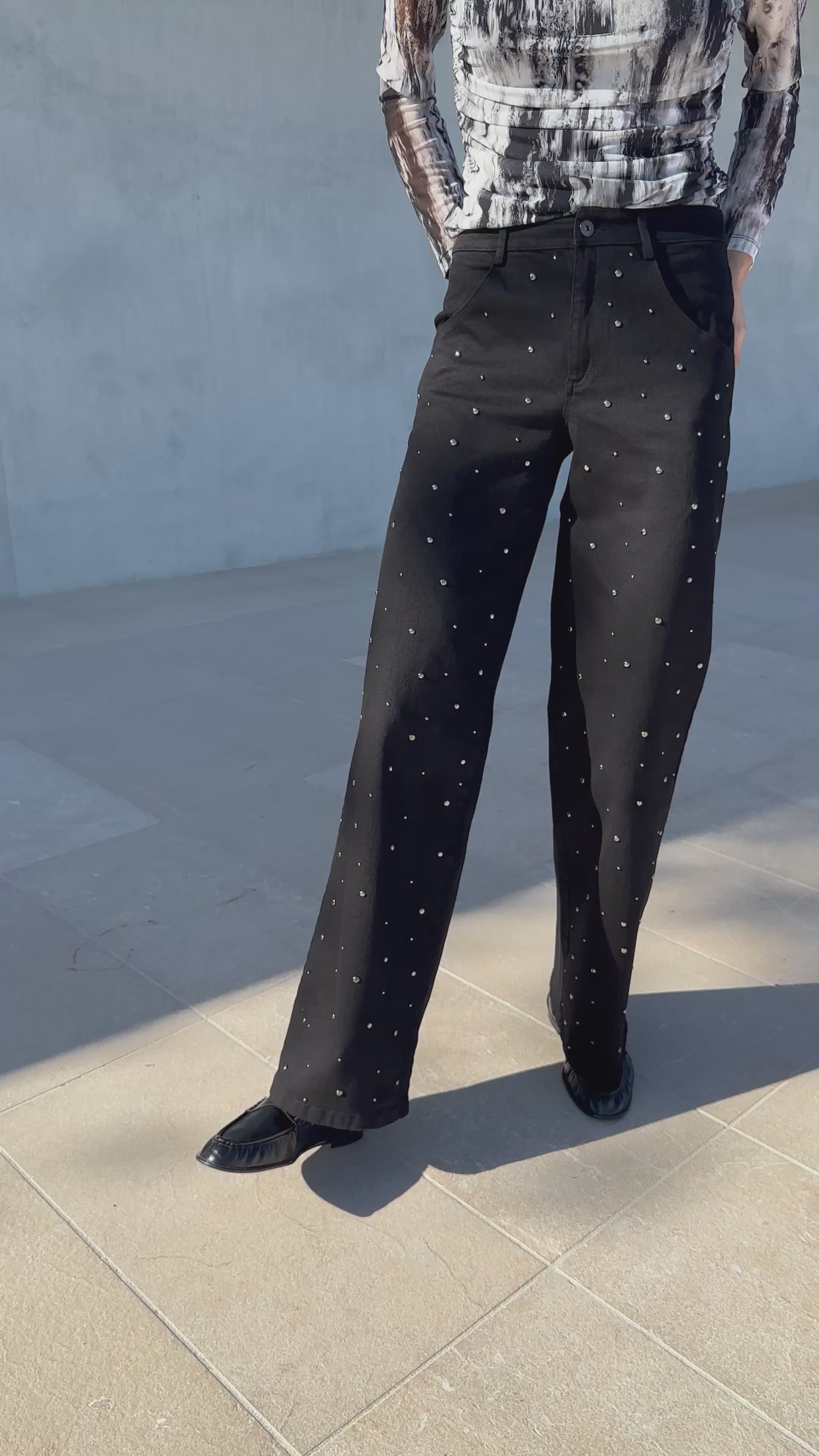 Le jean Gabriel capte la lumière comme un bijou discret : une pluie de micro-clous rehausse le noir profond du denim pour signer une allure city-glam parfait pour cette saison.